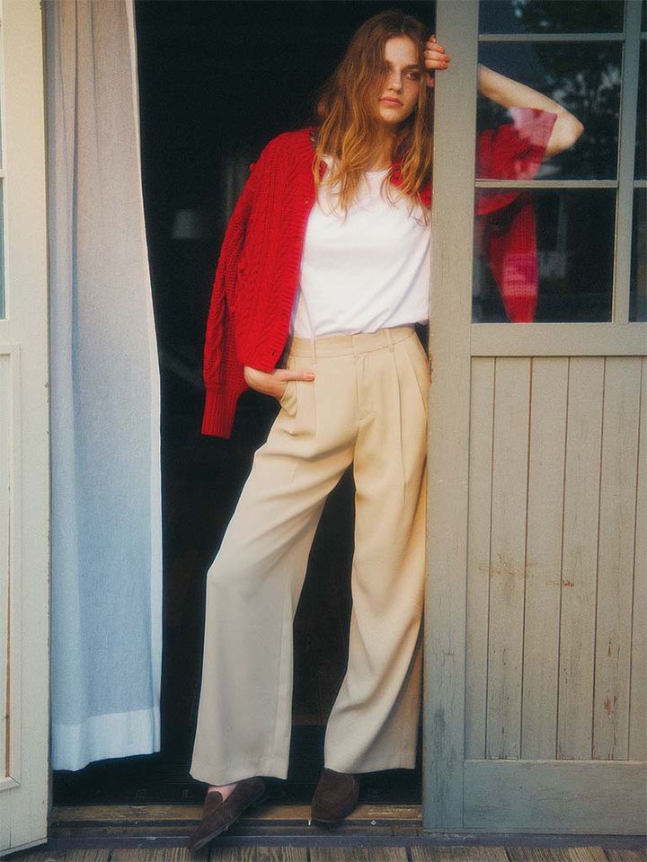 ゆるい着方が多くなりそうだから、カーディガンはきちんとして見えるクルーネックの短め丈をセレクト。一気に秋らしさが高まる深みのある赤も、コンパクトかつ羽織りものなら気張らずとり入れやすい。夏の装いに重ねるだけで季節感が増す手軽さもうれしいポイント。