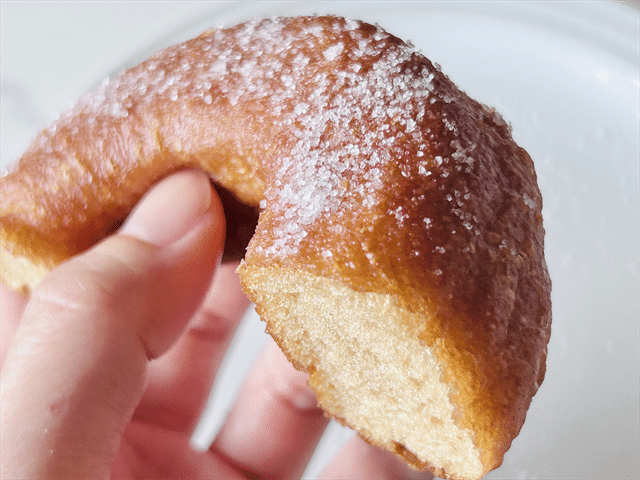 まずは、グラニュー糖なしでいただきます。温める前はパン生地のような質感だったのに、揚げたてのようなサクッジュワッな食感に。表面は香ばしく、中はフワッとしています。