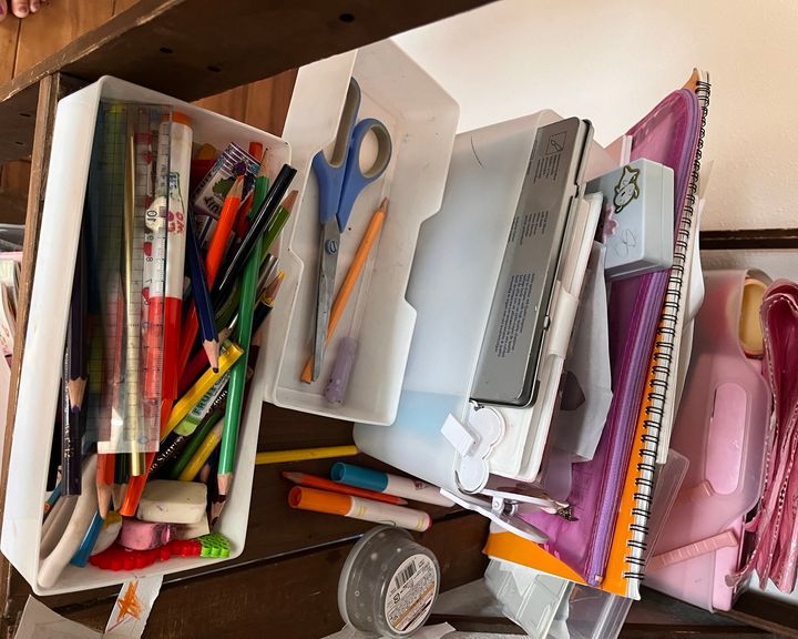 ハサミ、ペンは出しっぱなし。フタつきの箱は常に空いている。