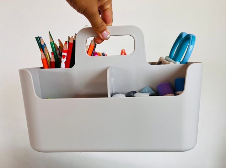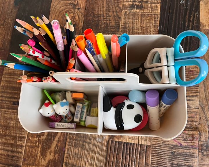 文房具、色鉛筆、ペン、はさみ、消しゴム、のり、セロテープなどが1つに収納できました。