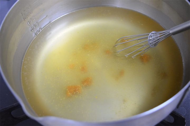 2鍋で湯を沸かしたらコンソメを加えてよく溶かし、粗熱をとる。