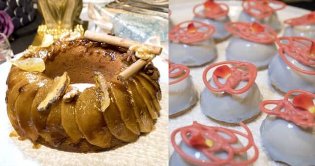 「王妃のお夜食」は、シナモン、クローブ、アニス風味のキャラメルで煮込んだたっぷりのリンゴで包み、ローストした胡桃やドライフルーツを飾った紅茶風味のケーキです。そしてひと口サイズの「パピヨン」は、秋に美味しいスモモ “ミラベル” ムースの中に香水のように香るベルガモットジュレが入っています。