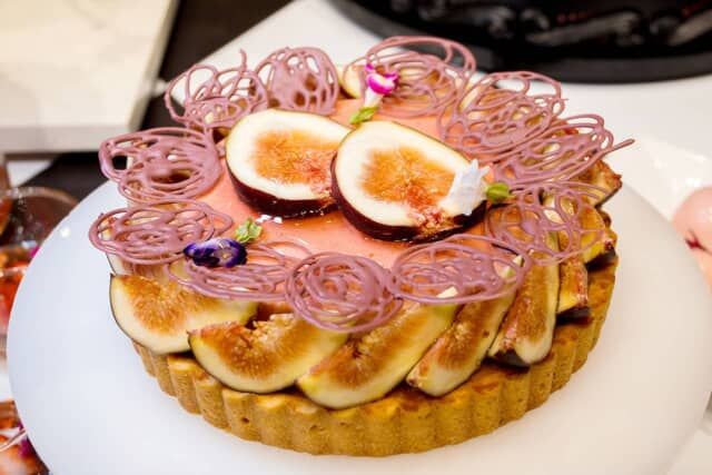 王妃が身に着ける宝石をイメージした「ビジュー・ロトンヌ」は、繊細なチョコレート細工と、蜂蜜でマリネしたイチジクの実が無数に並ぶ華やかさ。グァバやイチジク入りのホワイトチョコレートのムースを乗せたクリームチーズタルトです。
