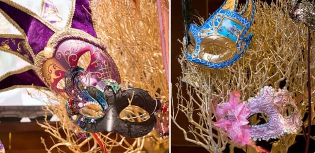 マーブルラウンジの一角に飾られたデコレーション。仮面舞踏会の会場を思わせる大階段や仮面、蝋燭が灯るシャンデリアなど、ルイ王朝時代の華やかさが伝わります。