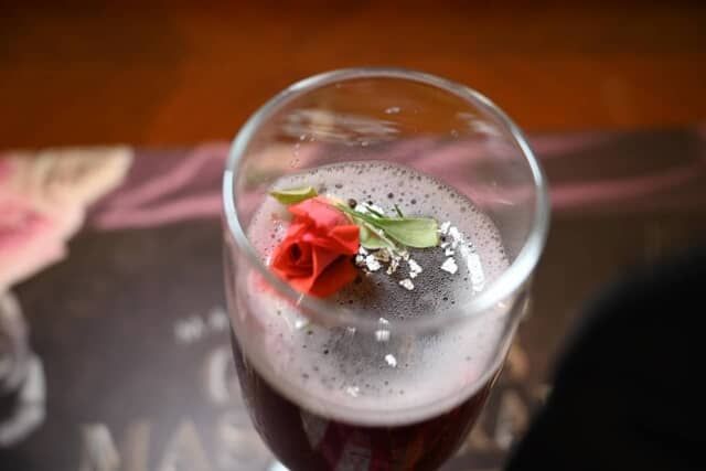 ▲ウェルカムドリンクはバラの花が飾られたモクテル