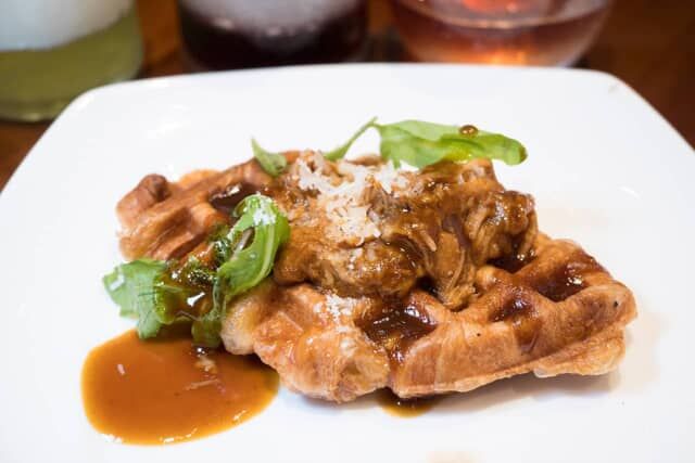 クロワッサンの生地をワッフルの形に焼き上げた “クロッフル” もおすすめ。味の染みた細かく裂いたポークがトッピングされ、ルッコラとパルメザンチーズが添えられます。