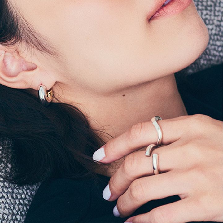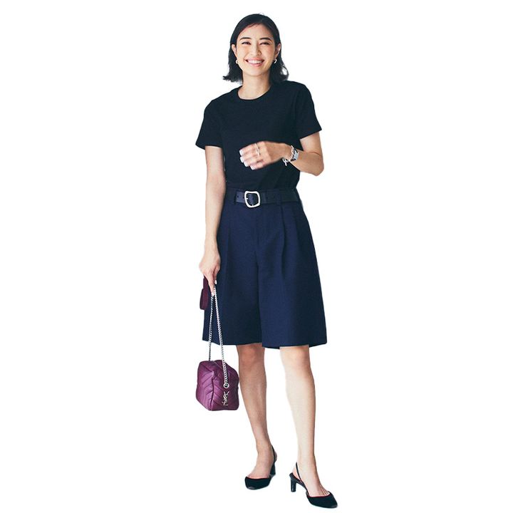 エルメスのHウォッチは数年前に母から譲り受けたもので、一緒につけているエルメスのブレスレットは、夫抜きで旅行に行くこともあるほど仲良しの義両親が結婚した年に贈ってくれた宝物。娘がまだ小さいのもあって、普段は時計やジュエリー類を封印中ですが、お仕事モードにスイッチを入れるときにこの2つをお守り的にセットでつけるのが定番です。人差し指のmimi33と中指の#FFFのリングは、程よくデザイン性も存在感もありつつ、どんなコーデにも合う万能さで重宝。プチバトーのTシャツにオブラダのショートパンツを合わせた黒紺コーデなので、シルバーで色味を統一させました。ピアスはインスタで見つけたロニというブランドです。
