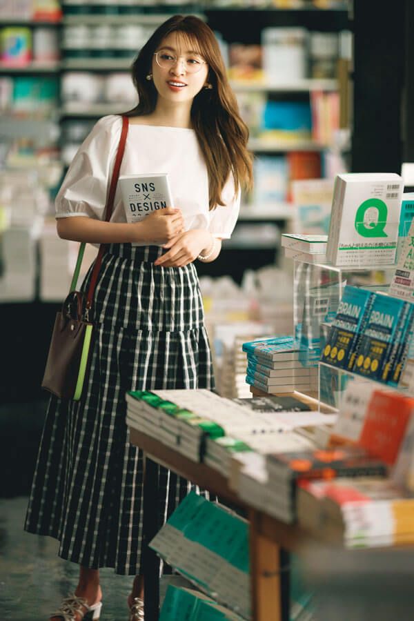 ブラウス¥14,300/ストロベリーフィールズ(シュガー・マトリックス) スカート¥19,800/ストラ イヤリング¥8,800/アビステ 眼鏡¥10,000/OWNDAYS ブレスレット¥11,550/エイチアッシュ(14 SHOWROOM) バッグ¥70,400/ロンシャン(ロンシャン・ジャパン) ミュール¥14,300/ダイアナ(ダイアナ 銀座本店)