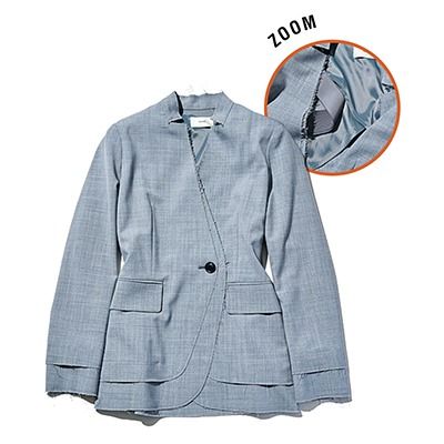 「肩口の内側につけたキャリーリボンに腕を通すことで、ジャケットを肩にかけた際もズレ落ちない仕組みに。そでを通して着ると暑さを感じる季節に重宝します」(ディレクター・西村カナコさん) シーズンを問わず使える、さらりとした手ざわりのブレンデッドウールを使用。切りっぱなしデザインで適度な個性を。