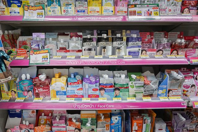 タイのお土産として大人気の「パウチ入りコスメ」は、コンビニでもこれだけの種類がそろっています。タイ発のコスメブランドはもちろん、なかには日本や韓国メーカーのものまで。ビオレの日焼け止めもありました。