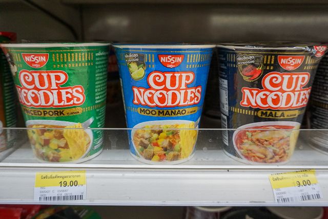 日本のメーカー「日清」のカップヌードルの現地らしい味も発見(各19バーツ)。左から「ミンスドポーク(ポーク&ガーリック)」「ムーマナオ(ポーク&ライム)」「麻辣」はお土産にもよさそうですね。