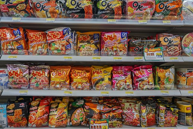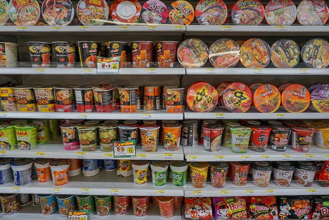こちらはカップ麺。タイのブランドだけでなく、韓国製品も目立ちます。大型スーパーでは複数のセット商品が中心に販売されているので、単品で購入したい場合はコンビニが狙い目かもしれません。