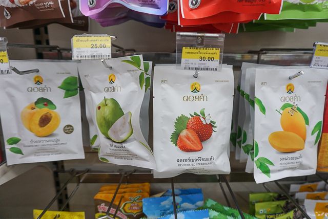 お菓子コーナーには、人気の「DOI KHAM BRAND(ドイカムブランド)」のドライフルーツが売られていました(各25〜30バーツ)。こちらもスーパーで見つけたものより小袋で、お試しに買うにはちょうどよいサイズかもしれません。筆者のおすすめはマンゴーです。