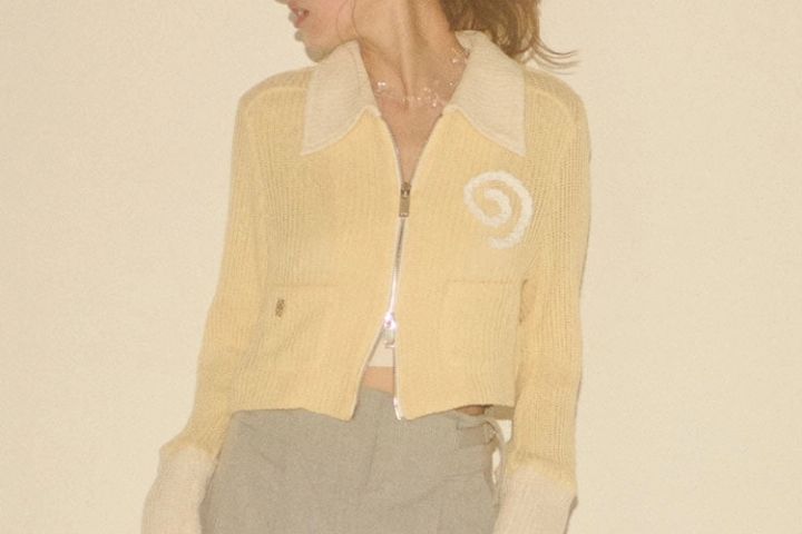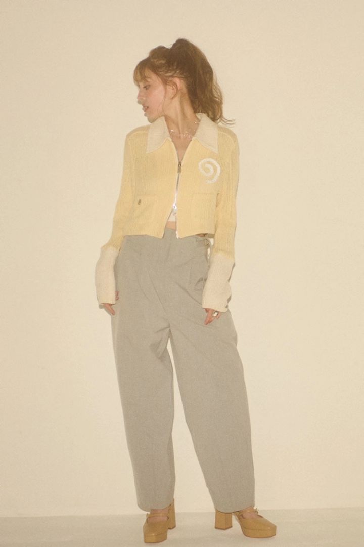 イエローショート丈ニット 25,889円/KIJUN(MUSINSA GLOBAL STORE) グレーハイウエストワイドパンツ 12,650円/31 Sons de mode(ヒロタ) ネックレス 770円/PHILLY リング 27,500円/MIKSHIMAI(SHOWROOM CHRMR) Wストラップパンプス 9,900円/RANDA