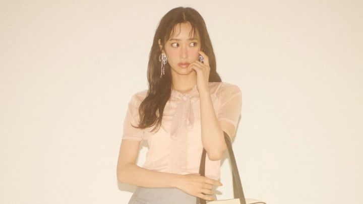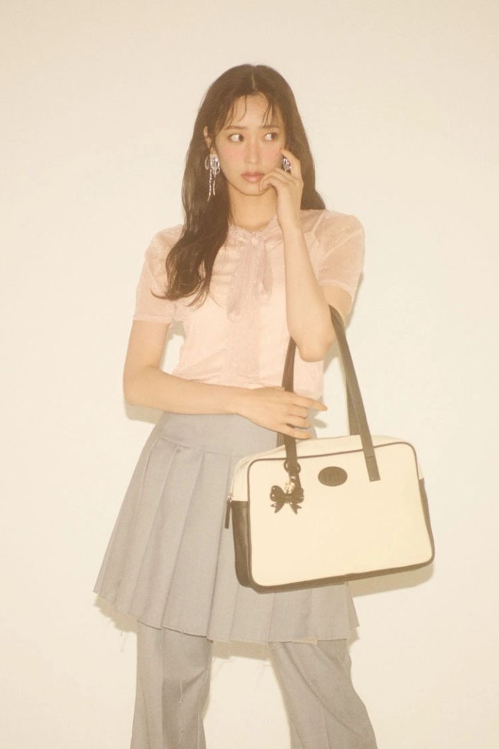 ピンクシアーラメブラウス 6,490円/31 Sons de mode(ヒロタ) プリーツスカートつきパンツ 11,000円/Alley by w closet(WEARS INC.) イヤリング 990円/ラティス バッグ 9,503円/Fillintheblank(MUSINSA GLOBAL STORE) バッグにつけたチャーム 14,080円/String Ting(SHOWROOM CHRMR)