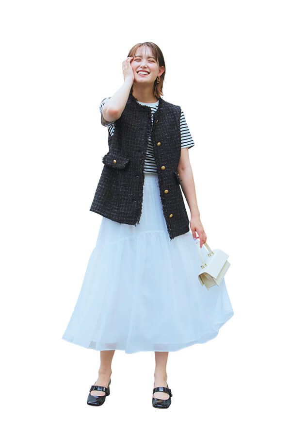 ジレ¥23,100/ストロベリーフィールズ(シュガー・マトリックス) カットソー¥9,900/ジャスグリッティー スカート¥18,700/CELFORD ピアス¥15,400/MERAKI(フラッパーズ) バッグ¥74,800/TAMMY & BENJAMIN(H.P.FRANCE) シューズ¥16,900/CHARLES & KEITH