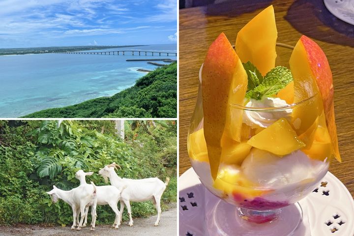 左上/竜宮展望台から見た景色。右/ホテルから徒歩圏内にある「楽園の果実」のマンゴーパフェ。左下/集落ではお散歩中のヤギに遭遇!