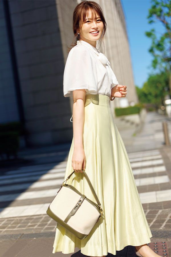 気分までフレッシュになれる色合わせなら、仕事のモチベもUP。シャイニーな光沢を放つスカートで、日差しを受けて歩く姿にもオーラを感じさせて♡