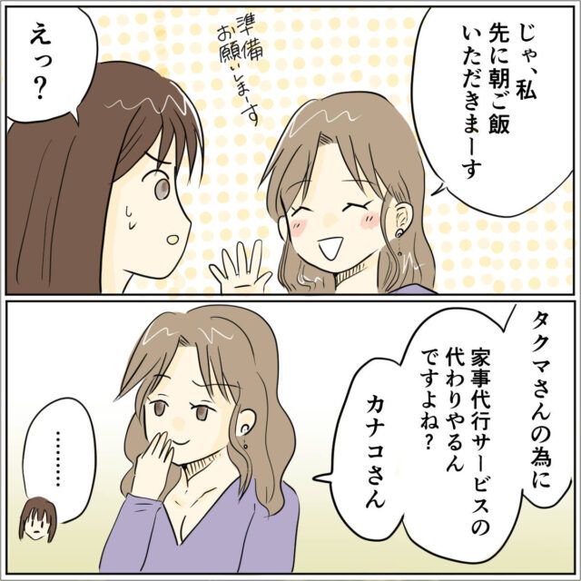 「じゃ、私先に朝ご飯いただきまーす」と、ユウコさんはまるでお手伝いさんに言うかのように私に言いました。唖然としていると、ユウコさんは「タクマさんの為に家事代行サービスの代わりやるんですよね?カナコさん。」ププッと笑いながら言いました。私は言葉が出てきませんでした。