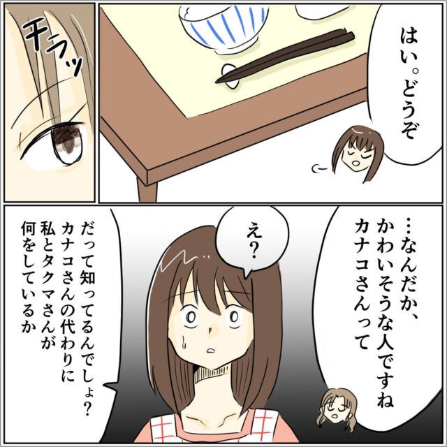 「なんだか、かわいそうな人ですね、カナコさんって。だって知ってるんでしょ?カナコさんの代わりに私とタクマさんが何をしているか。」