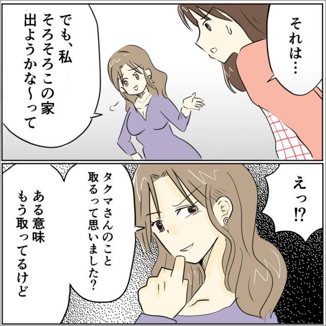 夫タクマさんは、妻カナコさんのつわりが酷く、自分の生活に合わせた望み通りのサポートや家事ができない分代わりにやってくれる人としてユウコさんを同居させていましたが、ゆうこさんの上手い誘導によってユウコさんは家事を放棄して代行サービスに任せ、自分は常にタクマさんの傍で「体調管理」をしていました。まるで恋人同士のようなタクマさんとユウコさんに動揺や不安、焦りを感じたカナコさんは妊娠前のように全ての家事を一人でこなすようになりましたが、そんなカナコさんを見てユウコさんは「必死ですね」とあざ笑うのでした。