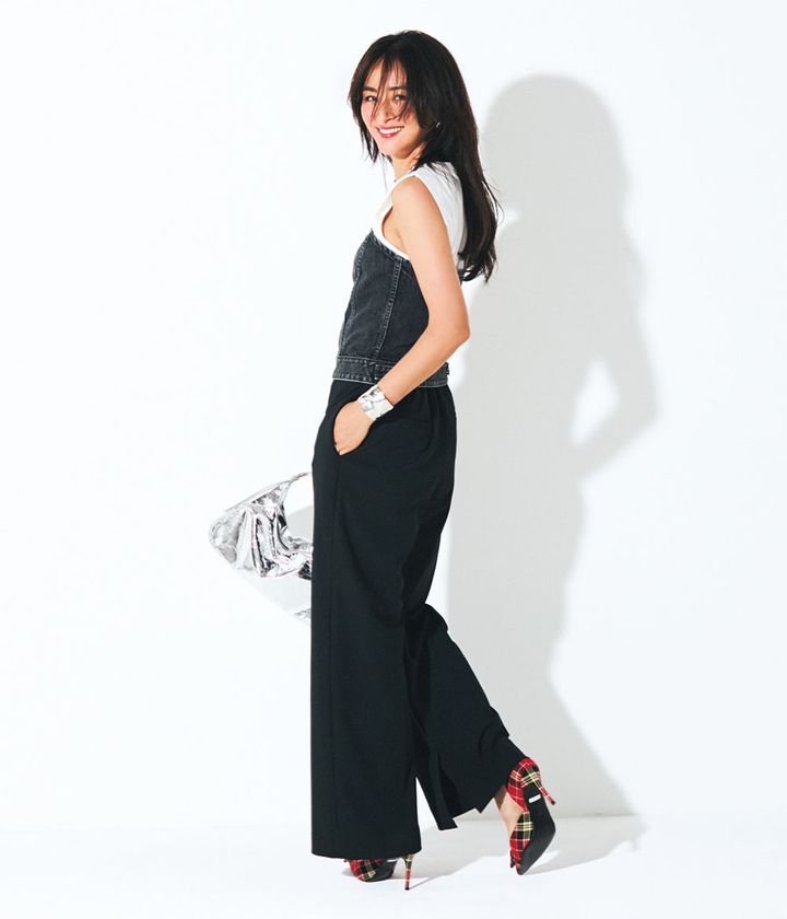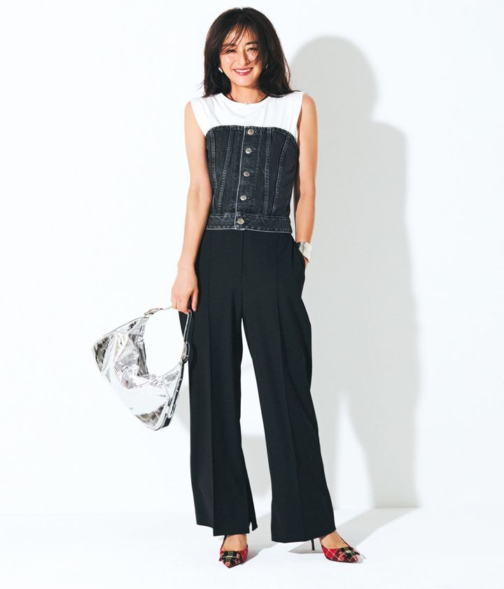 パンツ¥12,000(PLST)カットソー¥5,390(ビーミング by ビームス/ビーミング ライフストア by ビームス ららぽーとTOKYO-BAY店)ビスチェ¥28,600(ハイク/ボウルズ)バッグ¥6,490(カシュカシュ/アンビリオン)パンプス¥31,900(ツル バイ マリコ オイカワ)ピアス¥41,800ネックレス¥38,500(ともにウノアエレシルバーコレクション/ウノアエレ ジャパン)バングル¥41,580(ソコ/ZUTTOHOLIC)
