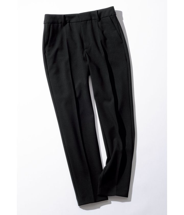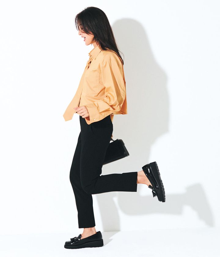 万能な黒テーパードパンツは、どんなトレンドトップスとも好相性。