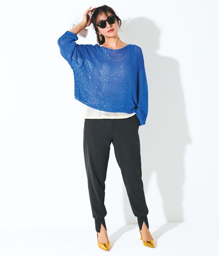 パンツ¥7,990(アンフィーロ)ニット¥8,800(アパートバイ/アダストリア)スパンコールタンクトップ¥30,800(エストネーション/エストネーション)バッグ¥3,960(THIRD MAGAZINE)パンプス¥36,300(PIPPICHIC/ベイジュ)サングラス¥47,410(オリバーピープルズ/ルックスオティカジャパン カスタマーサービス)ピアス¥28,270(ベン・アムン/ZUTTOHOLIC)バングル¥25,300(ワンエーアールバイウノアエレ/ウノアエレ ジャパン)