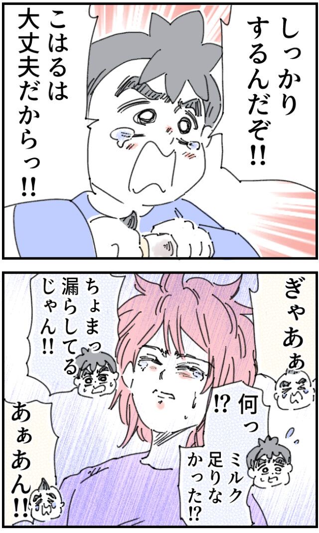 自分の身体のことよりもこはるちゃんの心配をしているかおりさんを少しでも安心させようと「大丈夫だから」と声をかけるいちろうさんですが、ミルクが足りなかったのがこはるちゃんはギャン泣き、オムツも漏れているようでいちろうさんは大慌て。これではかおりさんも安心できませんね。