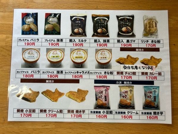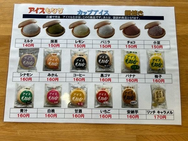 この日は鯛焼がお休みでしたが、アイスもなかだけでもこんなにたくさんの種類がありました! ミルク・抹茶・レモン・バニラ・チョコ・小豆の6種類は、お店でパリパリのもなかに冷たいアイスを入れた作り立てが食べられます♪ +50円であんこ入りもできます。
