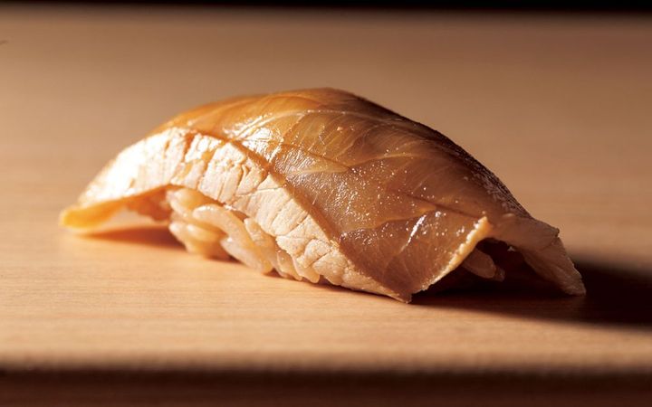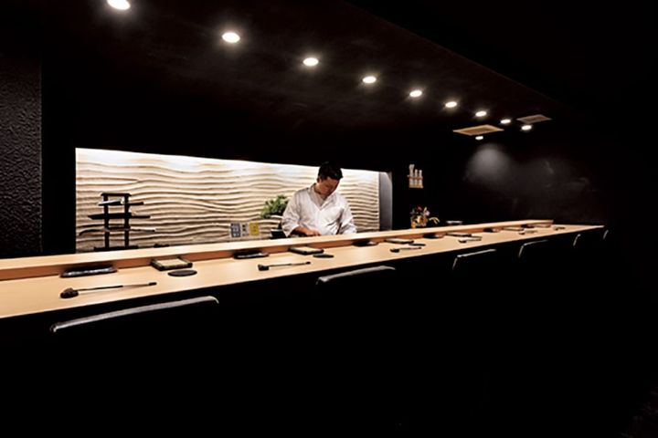 和食料理人の時分に魚を扱う奥深さに触れ、鮨職人に転身したという若き店主の西岡洋介さん。毎朝築地に通って仕入れた素材を前に「買ってから、どうやったら美味しくなるかを考えるのが楽しい」と笑顔に。例えば、こちらのスペシャリテとも言えるメカジキの握りは、日々状態を確認しながら45日間ほど熟成させ、食べ頃のサクを切り出したら表面を霜降りにして、漬けにしてから提供するという具合。素材の個性を見極めて引き出した、旨みや香り、食感に魅了されるはず。