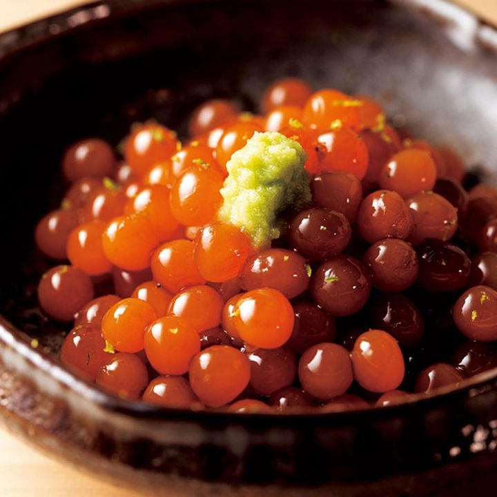 新物のいくらは80℃で湯煎して半熟に。口に入れるとぷつんと弾け、濃厚な味わいに包まれる。すべて¥16,500のおまかせより。