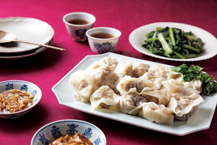 つるんと口当たりいい水餃子は、噛むと粗めに刻んだ海老が食感よく、葉ごと使ったセロリの風味が◎。鶏ひき肉が全体をあっさりとまとめて、ねぎ入りのたれと相性抜群。小松菜は生のまま使い、シャキッとした歯触りと青々しい香りを楽しめる副菜に。