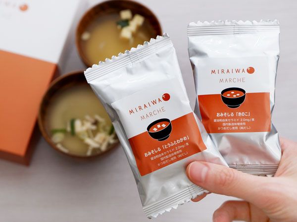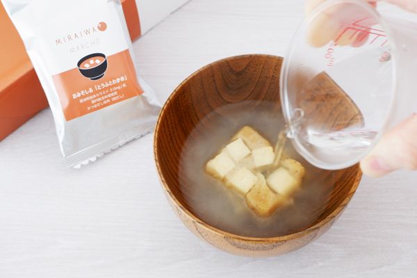 フリーズドライなので手軽においしく食べられるのが「ミライワ マルシェ おみそしる」。160mlの熱湯を注いでよくかき混ぜれば約1分で出来上がるので、忙しい毎日にも重宝します。