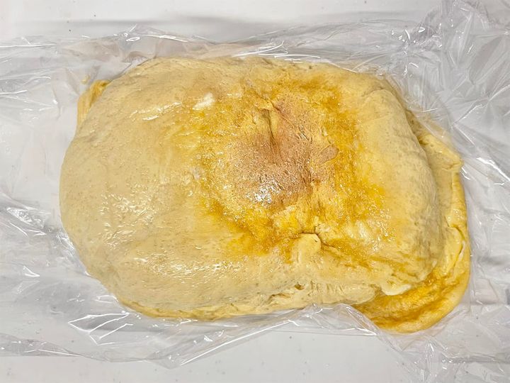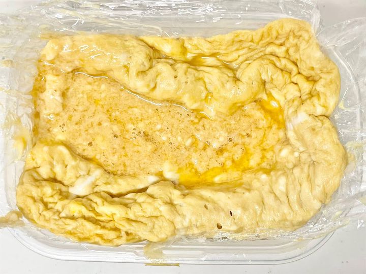 容器より一回り大きくラップをかけたら3の卵を流し入れ、ふわっとラップをかけます。