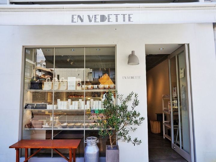 清澄白河駅から徒歩約6分、オリーブの植木が目印のスタイリッシュなお店が「EN VEDETTE(あん ぶでっと)」です。店内の色合いはとてもシンプルで、白を基調とした落ち着いた雰囲気。だからこそ、ショーケースに並ぶカラフルなケーキが目を引きます。