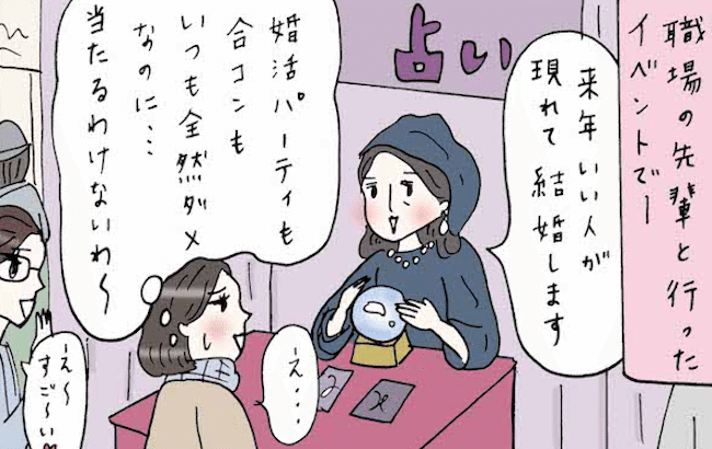 無料でタロット占いをやっているブースがあったので試しにやってみると、占い師に「来年いい人が現れて結婚するよ!」と断言されました。 当時、婚活パーティーや合コンに行くなど、頑張って婚活していた私。でも全然うまくいっていなかったので、「占いひとつで未来が変わるわけがない」「こんなうさんくさい占いなんて当たるものか」と、信じていませんでした。