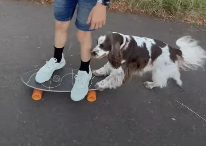 スケートボードを押してくれる犬さん、目的は少年と遊ぶことじゃなくて?