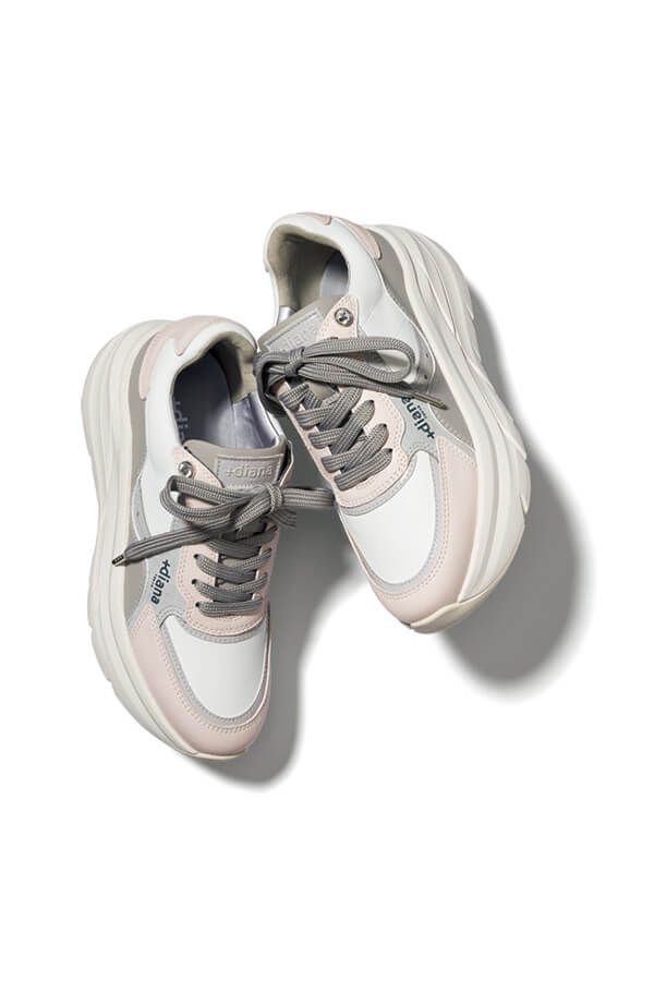 5㎝のボリュームソールは厚底だけど軽量! ピンクとグレーの配色はフェミニン派にも♡
