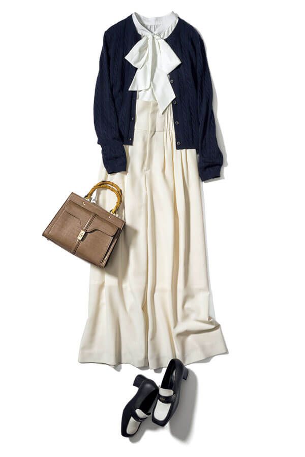 高貴なネイビーカーデをリボンブラウスでロイヤル寄せに。ケーブル編みの厚手の生地なので、品格のあるコーデに取り入れても申し分なし。カーデの色が濃いぶん、ブラウスやパンツは白を選んで軽やかに。