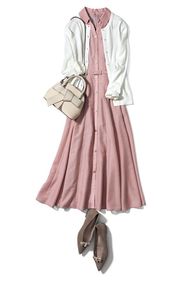 オフィスでの美人度を高めてくれるホワイト×ピンクの好感度配色。華やかなピンクワンピをお仕事で着るなら、カーデで面積を減らすのが正解。ユニクロのカーデは身幅&袖幅にゆとりがあるので、重ね着してももたつく心配もナシ!