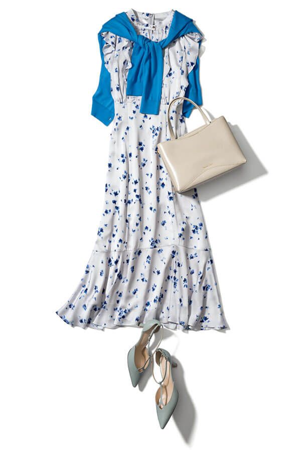 カーディガン¥2,990/UNIQLO ワンピース¥26,400/アプワイザー・リッシェ バッグ¥11,900/CHARLES & KEITH パンプス¥35,200/銀座かねまつ(銀座かねまつ6丁目本店)
