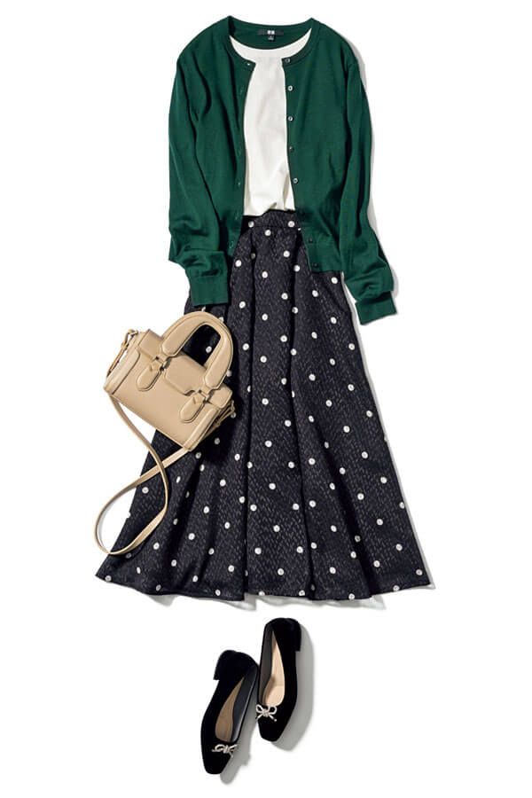ディープグリーンで秋を先取り×ドット柄で甘さもトッピング♡ 短すぎず長すぎない丈感でどんなボ トムとも合わせやすいベーシックなシルエット。トレンドのドット柄スカート&フラットシューズとの組み合わせでコーデが上品な印象に。