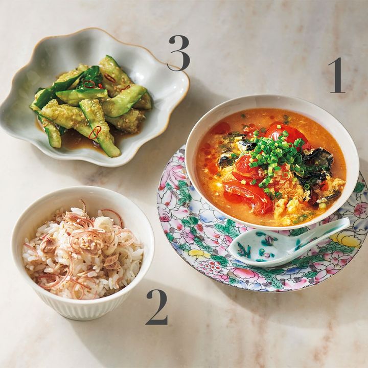 トマトのうまみとお酢の酸味、ラー油の辛みで、塩分を控えてもメリハリの利いた味わいに。具だくさんにするのも、減塩ポイント!