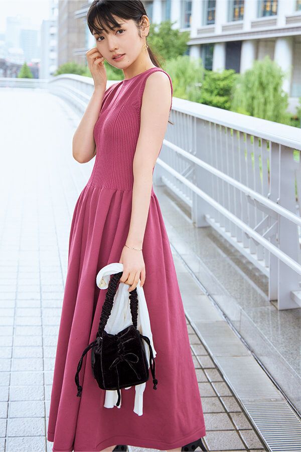 女っぽいピンクワンピを、黒のベロアバッグでさらに引き締め。胸元からウエストにかけてのリブが、ボディラインをきれいに見せてくれる♪