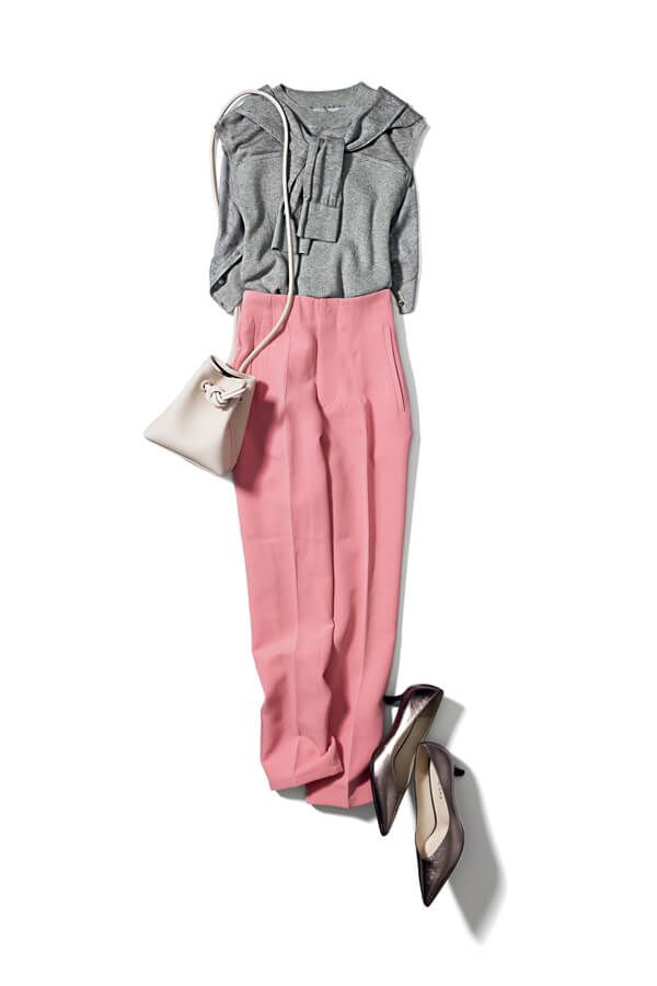 レディの心をつかむ鮮やかなピンクも、タックパンツならスマートでこなれた印象に。上半身はグレーでシンプルにまとめつつ、カーディガンを肩掛けすることで大人の余裕を漂わせて。