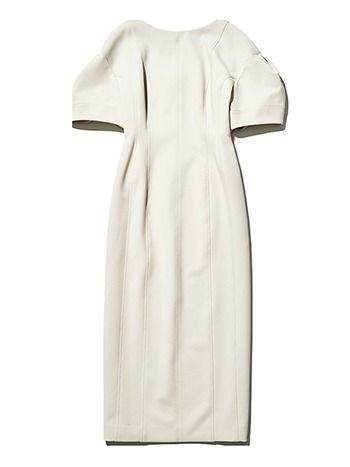 グレージュダブルクロスワンピース/uncrave WHITE(uncrave) 構築的な形ながら、弧を描くラインやマイルドなベージュの色味が相まって、女性らしくやわらかな雰囲気。背面のV字にカットされたデザイン。