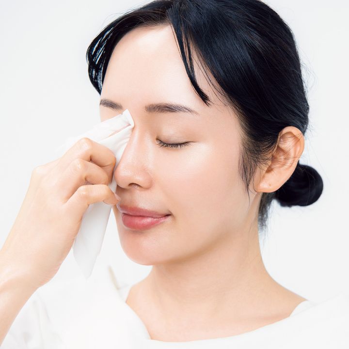 目頭のくぼみにはオイルが溜まりがち。忘れずに押さえ取って。その後ぬるま湯で洗い流す。ベタつきが気になるなら泡洗顔を。