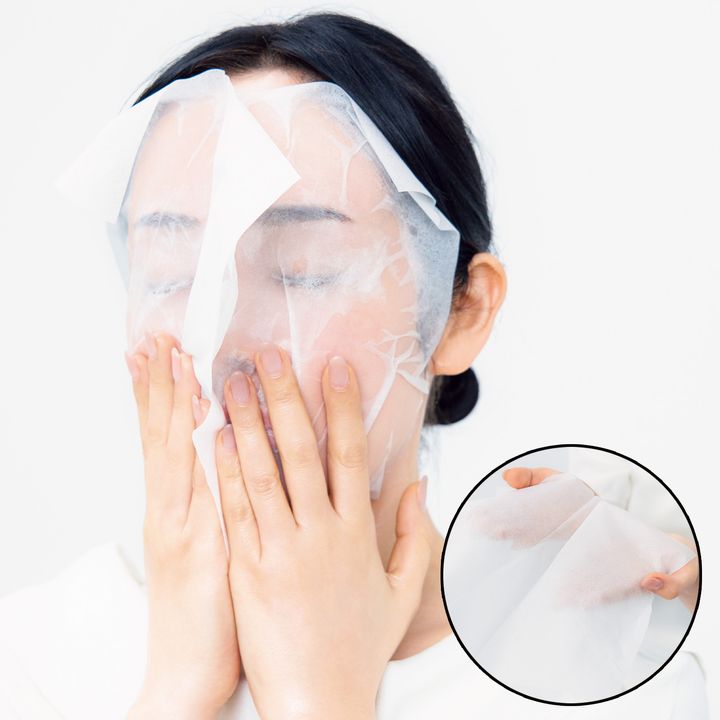 ティッシュ1枚を2枚に裂いてそれぞれを半顔にのせます。肌がサラッとするまで繰り返して。だいたい2回が目安です。