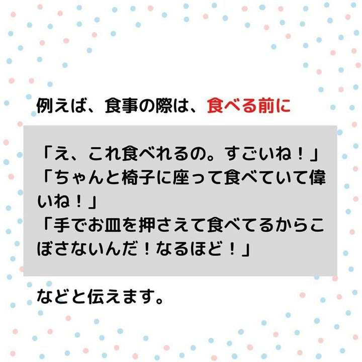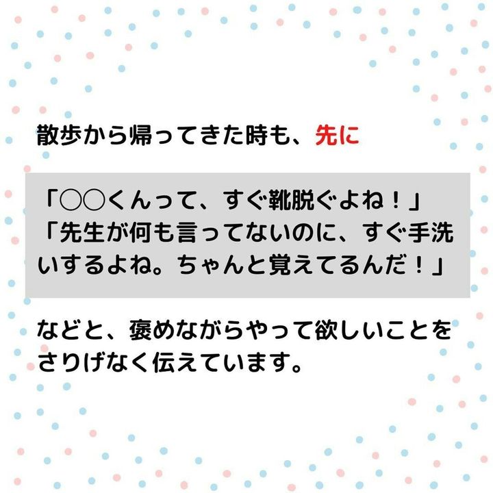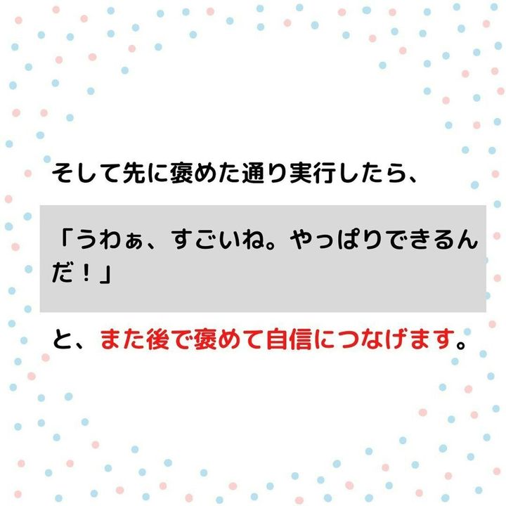 先に褒められたことを子どもが実践した後に「すごいね」と褒めてあげれば、子どもは喜ぶとともに「がんばってよかった」と成功体験を重ね、自信にもつながるでしょう。